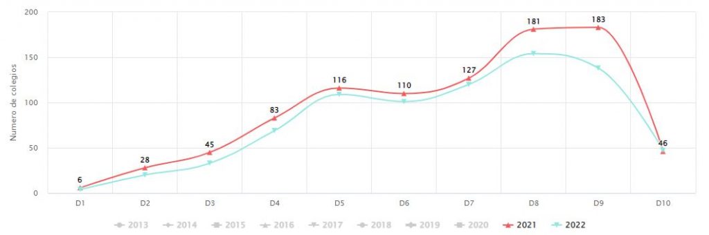 Colegios en categoría D1: 4; en D2: 20; en D3: 33; en D4: 69; en D5: 109; en D6: 101; en D7: 120; en D8: 154; en D9: 138; en D10: 47.